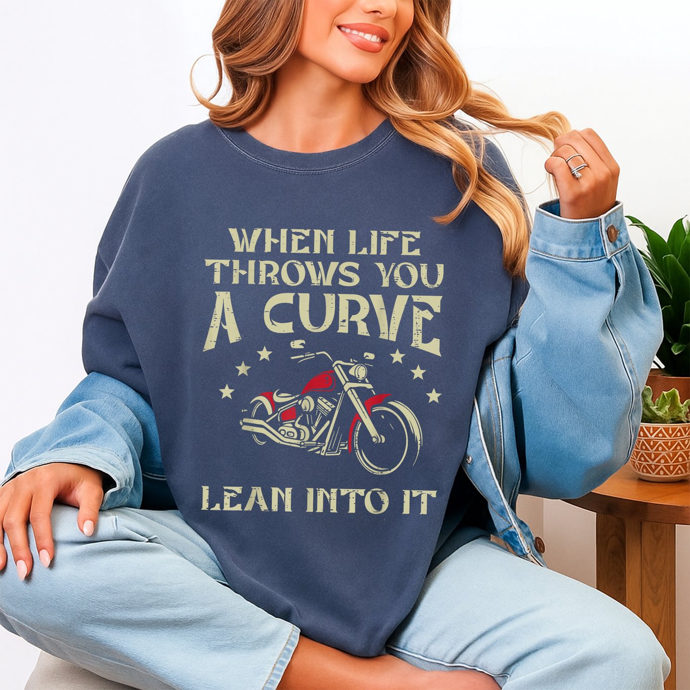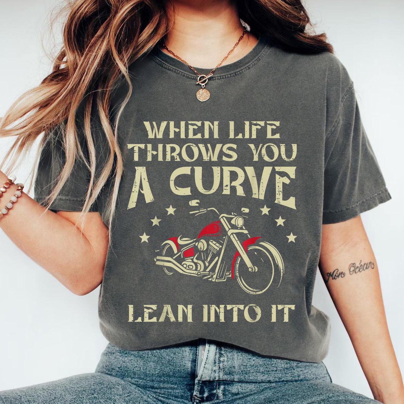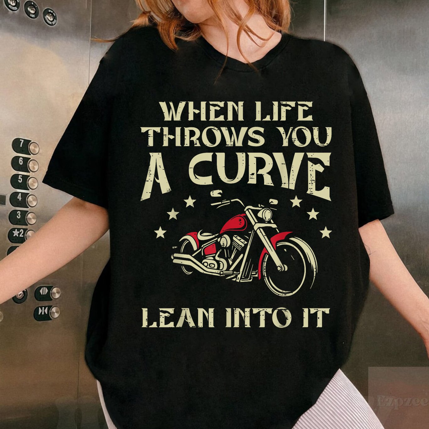 **Biker When Life Throws You A Curve Motorcycle T-Shirt** Show your love for the open road with this bold When Life Throws You A Curve, Lean Into It motorcycle t-shirt. Featuring a sleek graphic of a classic motorcycle and a motivational message, this shirt is perfect for anyone who’s passionate about riding. **Product Features:** – **Eye-catching design:** Large front print with a vintage-inspired motorcycle and inspirational phrase – **Classic fit:** Comfortable unisex cut that pairs easily with jeans, shorts, or riding gear – **Soft material:** Made from high-quality, breathable fabric for all-day comfort – **Versatile style:** Suitable for men and women, great for daily wear or bike club meets – **Easy care:** Machine washable and designed to retain its shape and color This t-shirt makes a great style statement for those who love the freedom of the road and the thrill of riding. Choose it for your next adventure or gift it to a fellow biker. **Color:** Black with white and gray graphics **Material:** Lightweight cotton blend **Sizes:**