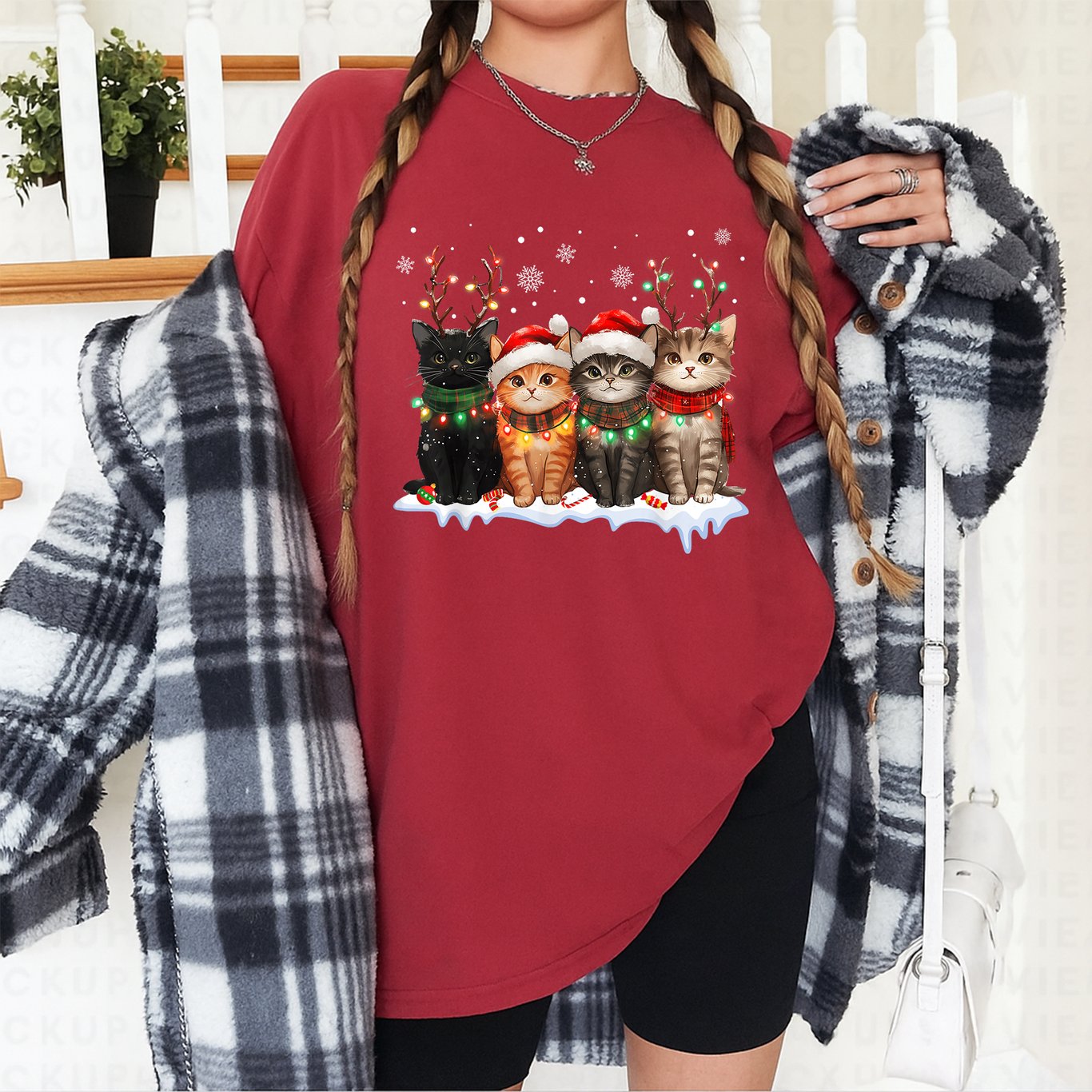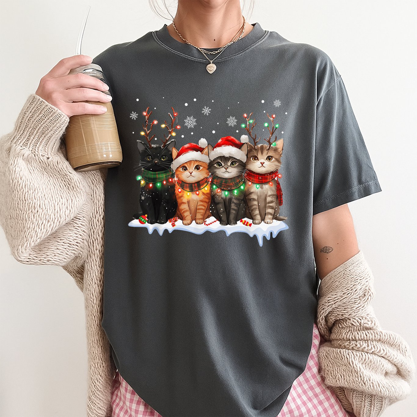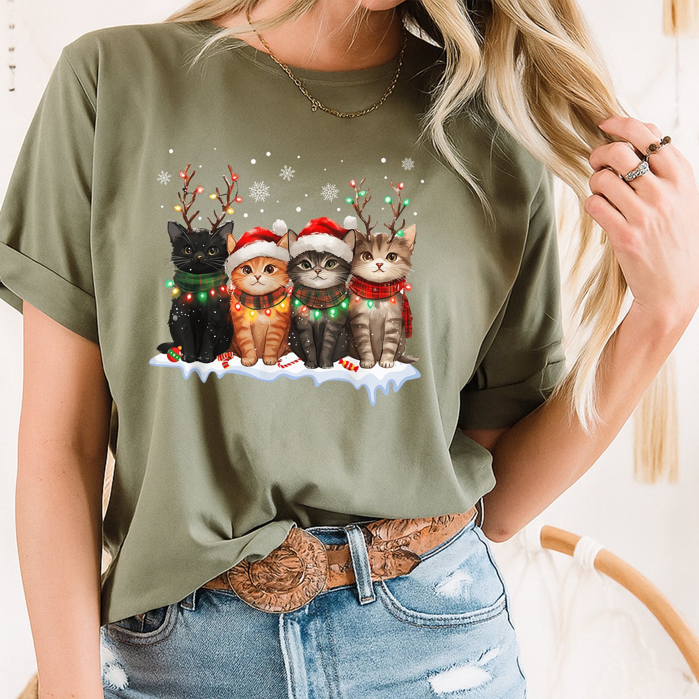 Bring some holiday cheer to your wardrobe with this festive Cat Christmas Light Reindeer Santa Cat Lover T-Shirt. Perfect for those who adore cats and love