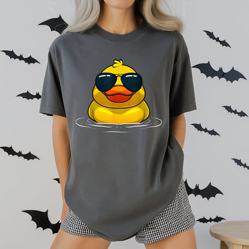 This fun and stylish t-shirt features a cool yellow rubber duck wearing edgy black sunglasses. The playful design stands out on a solid black background,
