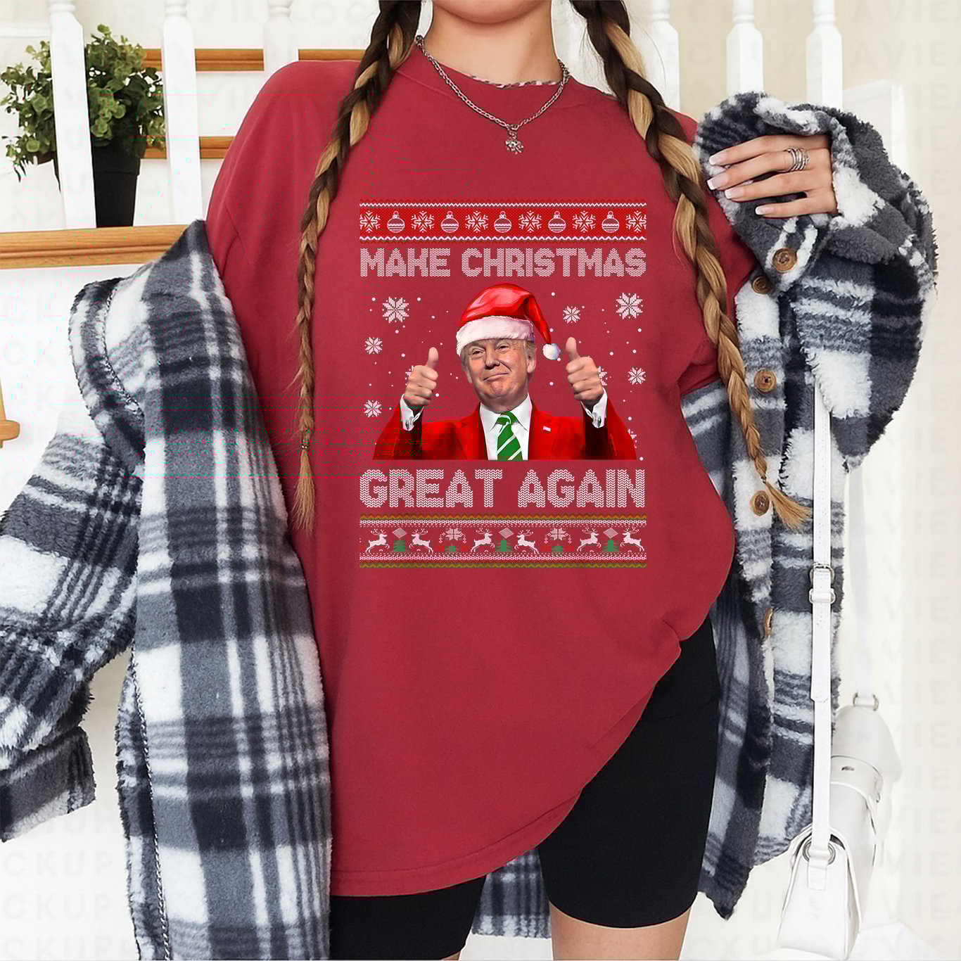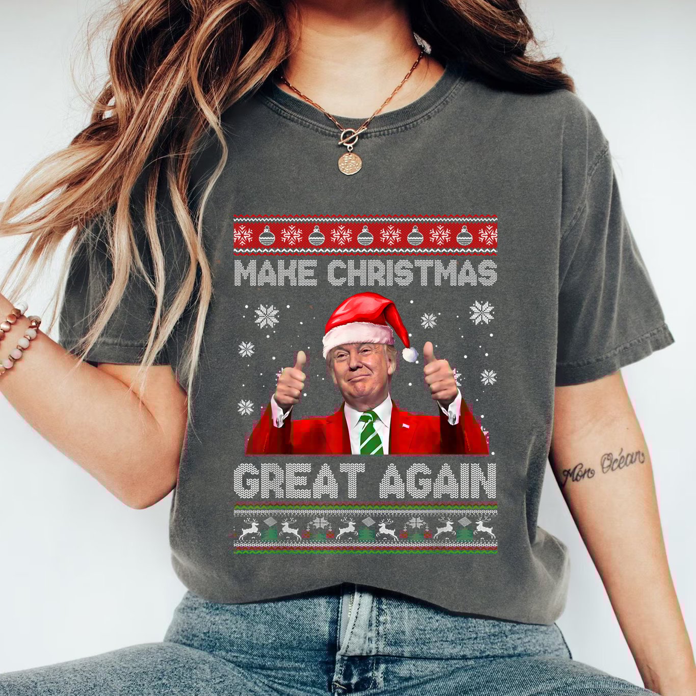 Make Christmas fun and memorable with these Make Christmas Great Again Funny Trump Pajamas Ugly T-Shirts. This shirt features a playful holiday design inspired