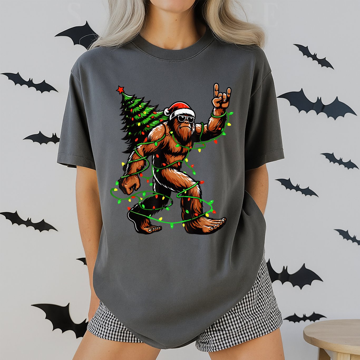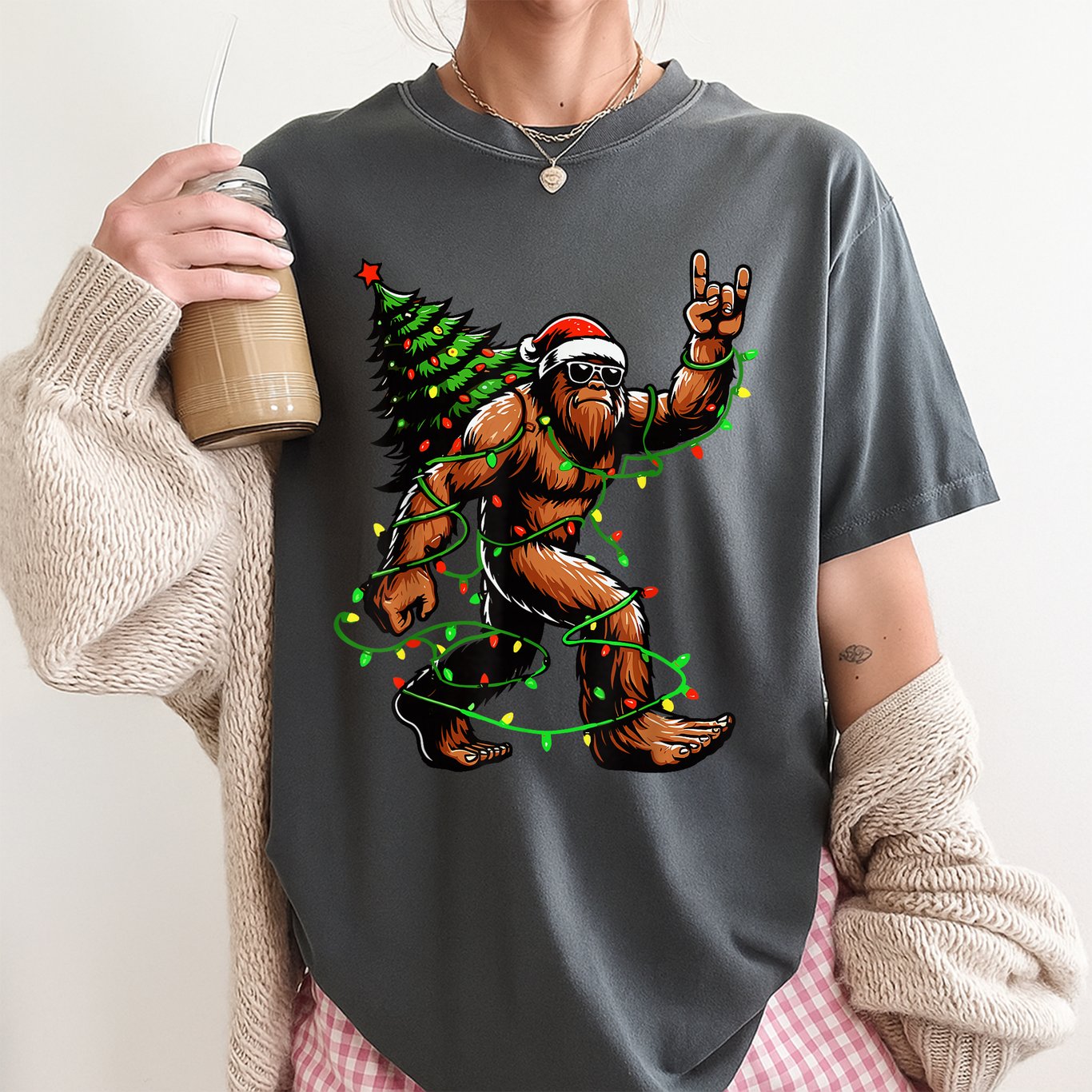 Santa Bigfoot Christmas Tree T-Shirt Funny Sasquatch Holiday Xmas Lights Graphic Tee